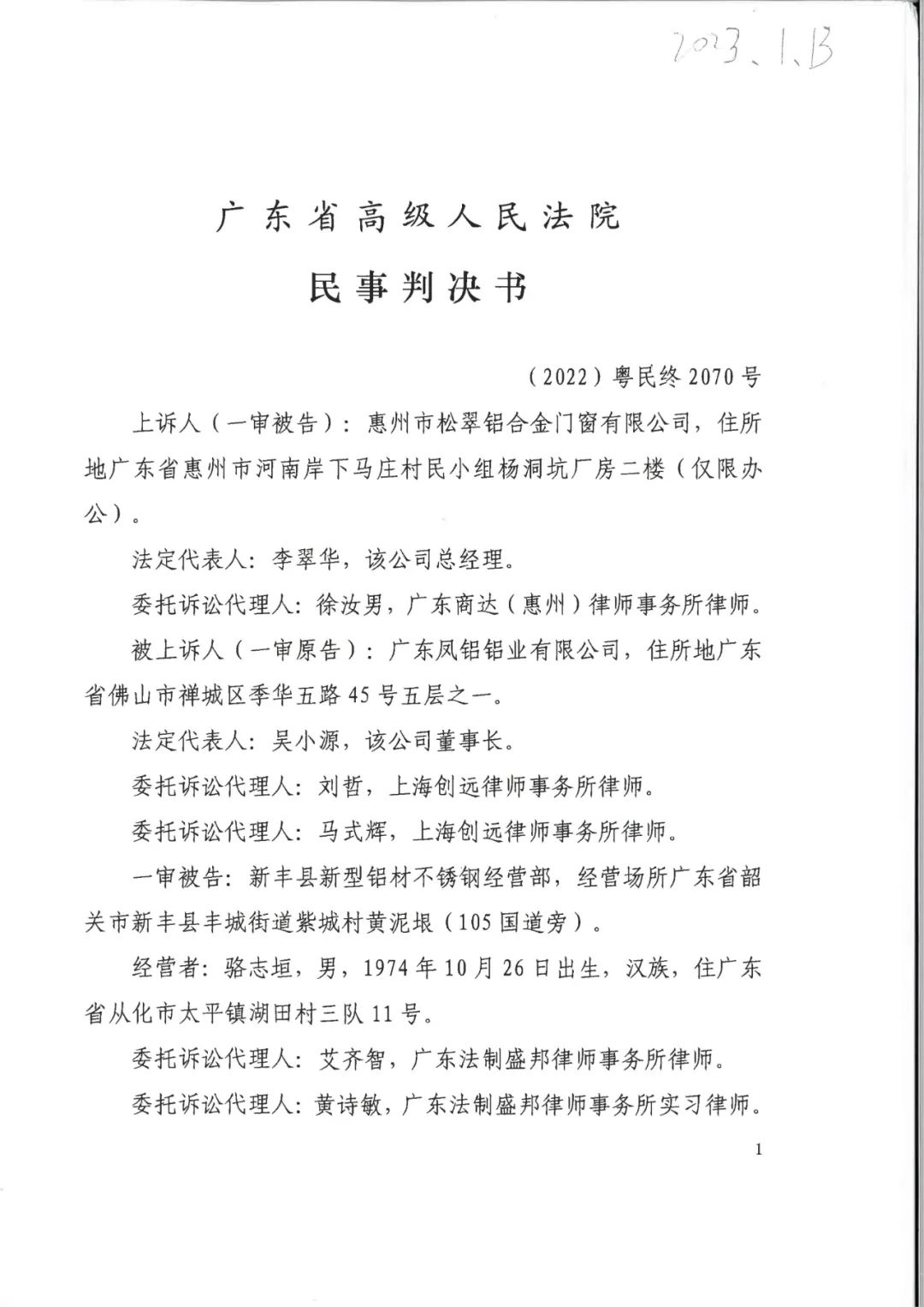 临汾辉知胜诉佳讯 | 侵害“凤铝”商标案广东高院二审维持原判,判决赔偿255万元